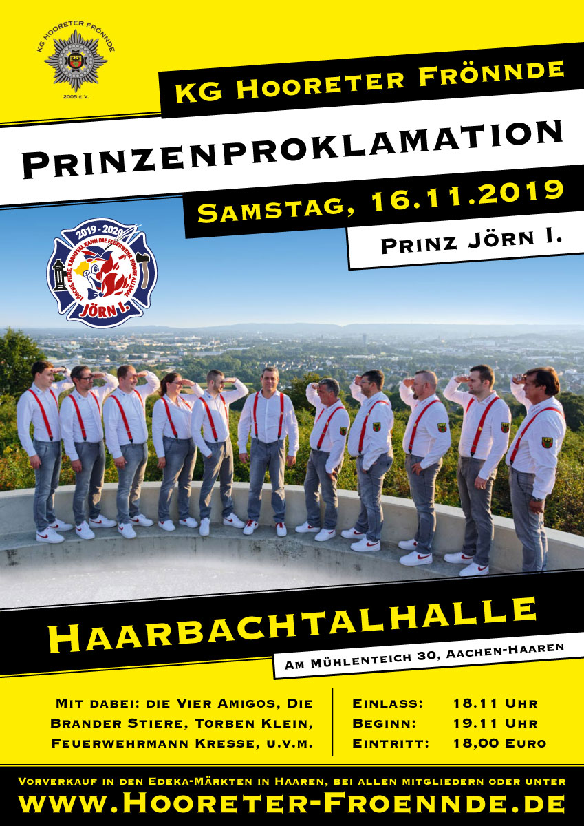 17.10.19 - In knapp vier Wochen ist es so weit. Der designierte Haarener Stadtteilprinz Jörn I. wird in der Haarbachtalhalle proklamiert. Los geht es um 19.11 Uhr, Einlass ist bereits eine Stunde vorher. Der Eintritt beträgt 18,- Euro und das Programm wird klasse! Seid ihr dabei?! Karten gibt es bei den EDEKA-Märkten in Haaren und bei allen Mitgliedern der Hooreter Frönnde.